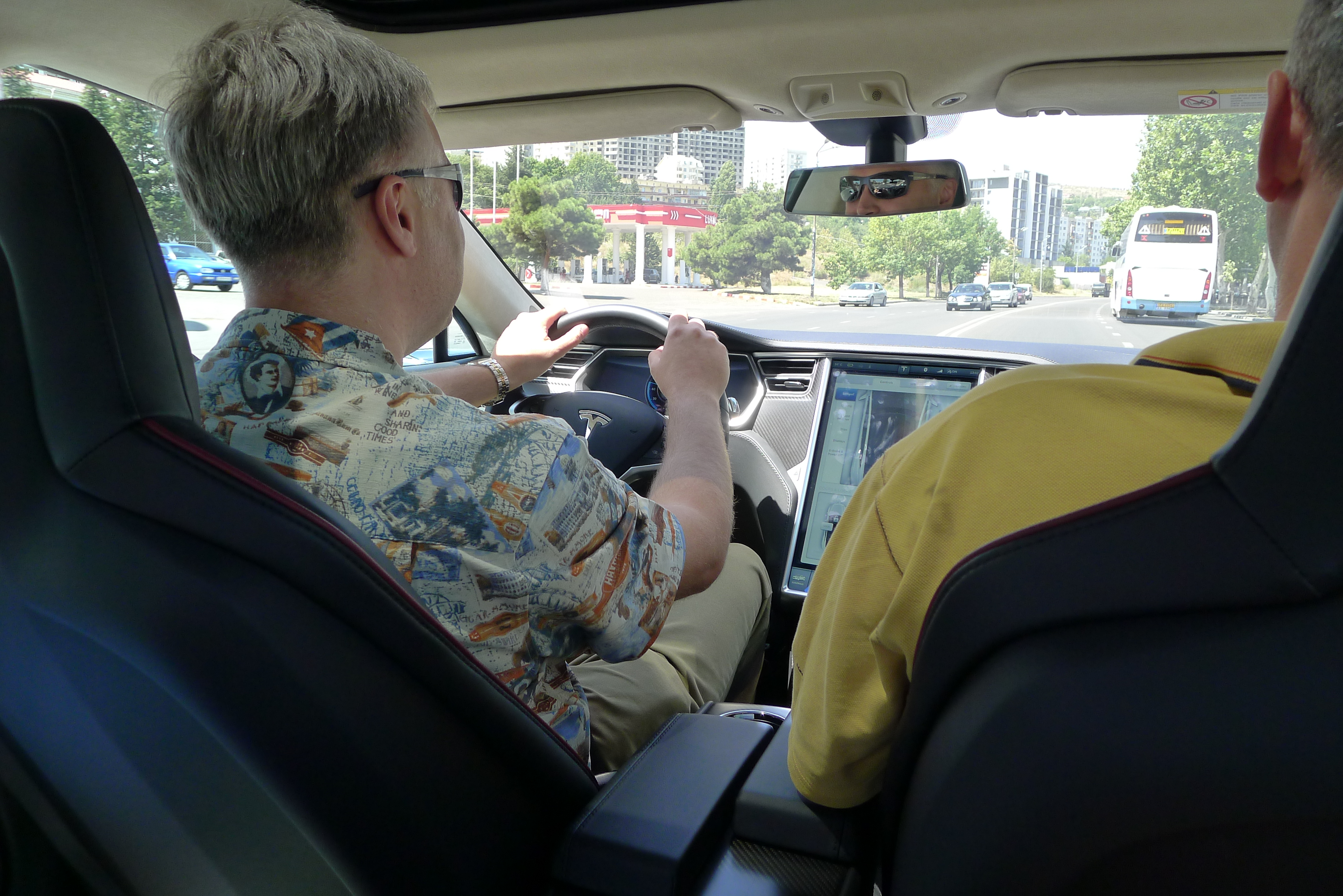 У банка Грузии машины тоже белые. Модель S. Я бы не сказал, что это спорткар. Я через пару часов на Палиашвили встретил Ламборгини серенький, вот это — спорткар. Но Тесла очень добротный автомобиль высокого класса. Пусть выглядит недостаточно агрессивно, но наворочена как надо. Я сначала назад залез, очень мне интересно было как там с моими 192 см сидится. Докладываю — сидится удобно. Может через несколько часов сидения и заболело бы что-нибудь, но за полминуты выяснилось, что единственное неудобство было снаружи в дверь втиснуться, а уже внутри сидеть нормально, кресло держит классно, колени в спинку переднего сиденья не упираются и вообще хорошо. А вот жена потом сзади ехала и говорит, что ей не понравилось. «Некомфортно. Какая-то недомашина. Неудобно». Я, если честно, не очень понимаю, ибо ездить ей приходится в основном либо на задней скамейке Прадо, либо на его переднем сиденьи и в Тесле сидеть, на мой вкус, несравненно удобнее. Впереди всё ещё лучше. Поддержка у сиденья со всех сторон хорошая, руль точно как я люблю, ни тянуться не надо, ни в грудь не упирается. Переключатель движения за рулем справа, где у Прадо управление омывателями и стеклоочистителями, 4 режима — P,D,N,R. В принципе для электромобиля ничего другого не надо. Кстати, в машине нет ни коробки передач, ни вообще какого-то намека на трансмиссию. Крутящий момент подается на ведущие (задние) колеса непосредственно с двигателя, а особенность электрического двигателя заключается в том, что ему все равно со скольки оборотов вы этот крутящий момент снимаете, он в любой точке максимальный. Поражает отсутствие звука. Кто-то из прокатившихся говорил, что без звука «не то». А я вам скажу ровно наоборот. Какой это кайф не понимаешь, пока не попробуешь. По мне звук мощного мотора хорош, когда стоишь снаружи и провожаешь взглядом вдаль пролетевший болид. А когда находишься внутри и рулишь, отсутствие любого шума научишься очень быстро ценить. Из того, что успел оценить — большой радиус разворота. Совсем не Мерседес, да. И когда выворачиваешь руль до упора создается впечатление, что то ли колеса об арки скребут, то ли будто слишком сильно на руль давишь и что-то сейчас сломается. Управляется точно и предсказуемо, но может быть не понравится некоторым «гонщикам», всё-таки заточили её больше под бизнес-класс, а не под спорткар и остроты на руле действительно нет. С другой стороны для бизнес-класса недостаточно смягчили подвеску, пробивает её на небольших неровностях на набережной вполне по «спортивному». Но главное ощущение, непередаваемое и офигительное, это разгон. По ходу полный сюр — ты жмешь на газ, никакого звука, никаких всхлипов, никаких вздохов в попытке нагнать рабочую смесь в цилиндры. Отклик моментальный и удивительный. Ощущение такое, как будто у тебя пытаются выдернуть машину из под задницы. Лететь она начинает моментально, вжимая тебя в спинку кресла.